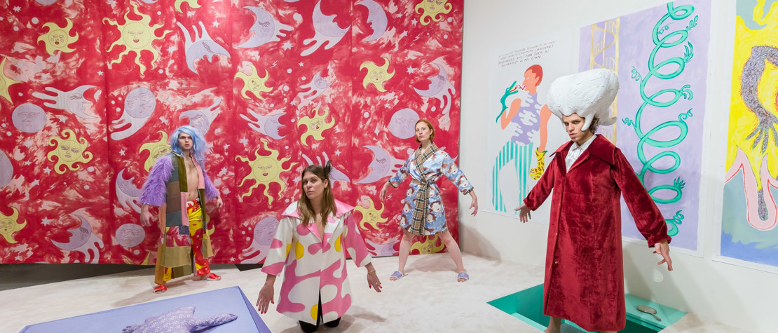 Det er torsdag kveld på Astrup Fearnley Museet og duket for Artist Talk. Tilskuerne går over en bro og inn i et forrom dekket av en tapet i et repeterende mønster som ligner speilegg. Her kan man ta av seg på bena og få på seg tøfler før man trer inn i hovedrommet der det henger et enormt rødt vevarbeid fra taket, med gule soler og lilla måner. På veggene henger malerier i sterke farger og atskillige tankekart fra prosessen. Gulvet er belagt med et mykt, hvitt teppe.