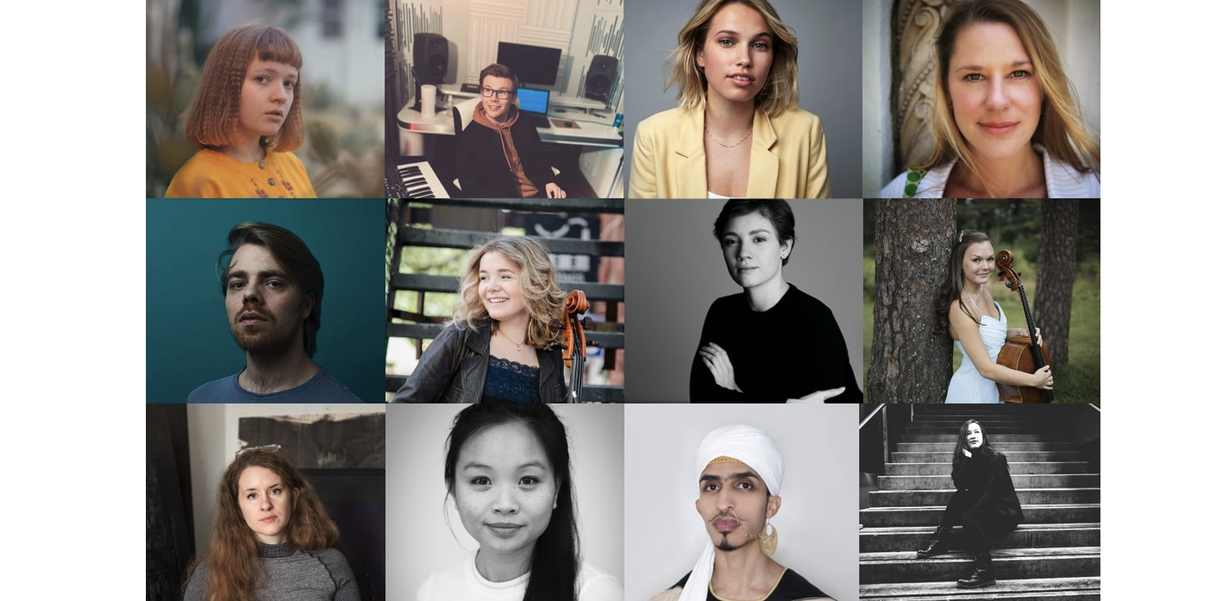 Bilde av talentene: Øverst f.v. Margrete Bergset, Torje Fagertun Spilde, Thea Sofie Loch Næss og Mie Gjersen Hansen. I midten f.v. Heiki Riipinen, Birgitta Oftestad, Inés Belli og Sandra Lied Haga. Nederst f.v. Idun Baltzersen, Catharina Vu, Ahmed Uhmar og Sonoko Miriam Welde.