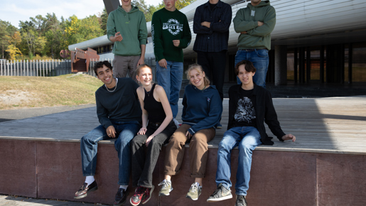 På bildet: Unge fotografer 2021/2022: Bak fra venstre: Markus Falao, August Reece, Olav Hylland og Farhad Soufi. Foran fra venstre: Mateo Tilrem, Katja Berg – Høyem, Mathilde Movik Lindstad og Michael Tvedt. Deltaker Alma Edit Hauge var ikke til stede da bildet ble tatt. Foto: Camilla Sune