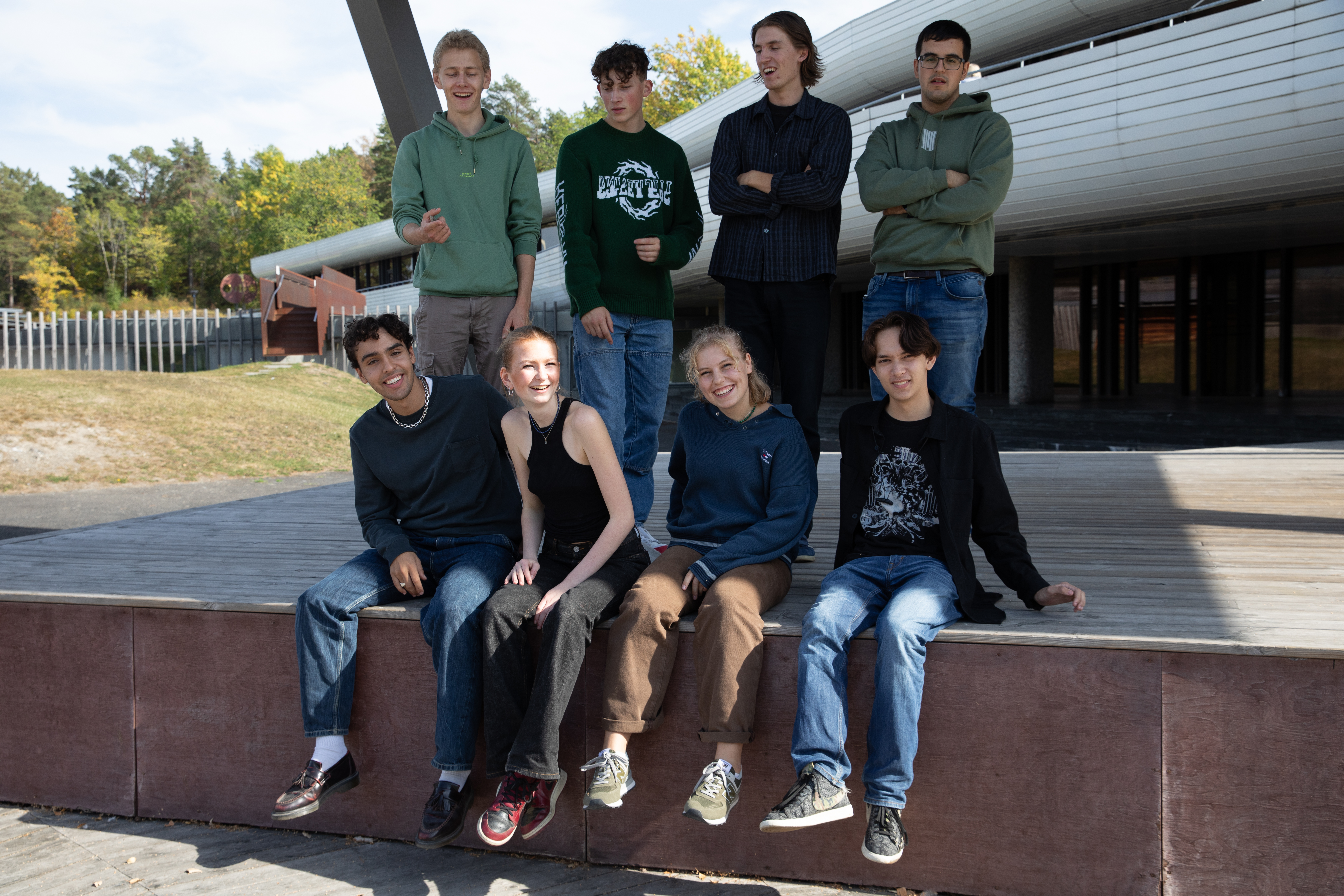 På bildet: Unge fotografer 2021/2022: Bak fra venstre: Markus Falao, August Reece, Olav Hylland og Farhad Soufi. Foran fra venstre: Mateo Tilrem, Katja Berg – Høyem, Mathilde Movik Lindstad og Michael Tvedt. Deltaker Alma Edit Hauge var ikke til stede da bildet ble tatt. Foto: Camilla Sune